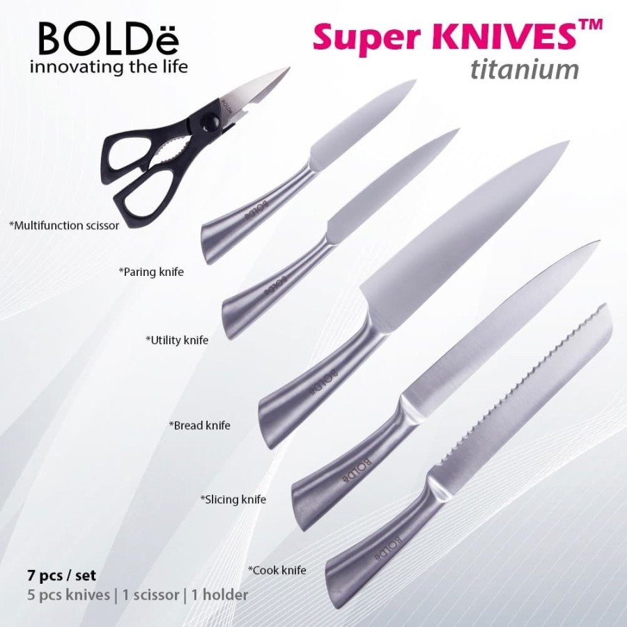 BOLDe Knife Set Titanium Knife Set premium series dari BOLDe yang terdiri dari 5 (lima) pisau,1 (satu) gunting multifungsi dan 1 (satu) standing holder (tempat pisau). Bolde Knife Set Titanium dibuat dengan teknologi dari italia menggunakan bahan stainless steel berdaya tahan kuat dan tingat ketajaman yang tinggi, dengan premium italian design sangat cocok untuk anda yang mempunyai selera seni yang tinggi dalam memasak. BOLDe Knife Set Titanium juga sudah memiliki sertifikat Food Grade. Feature : - Material Pure Stainless Steel - Design ergonomis - Berbahan kuat dan tidak mudah tumpul - Tahan lama dan anti karat BOLDe Knife Set Titanium terdiri dari : 1 Pcs Paring Knife 1 Pcs Utility Knife 1 Pcs Bread Knife 1 Pcs Slicing Knife 1 Pcs Cook Knife 1 Pcs Multifunction Scissors 1 Pcs Stand Holder